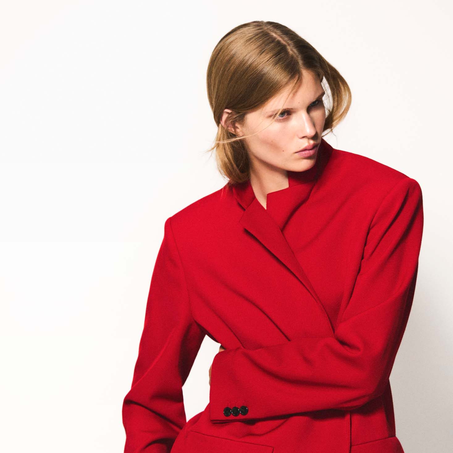 Wyraziste ramiona, precyzyjne kroje i uniwersalne dzianiny definiują linię damską. Inspiracją dla kolekcji stały się objętości charakterystyczne dla mody lat 80., widoczne w smokingowej sukience i dopasowanym czerwonym garniturze. Płaszcz