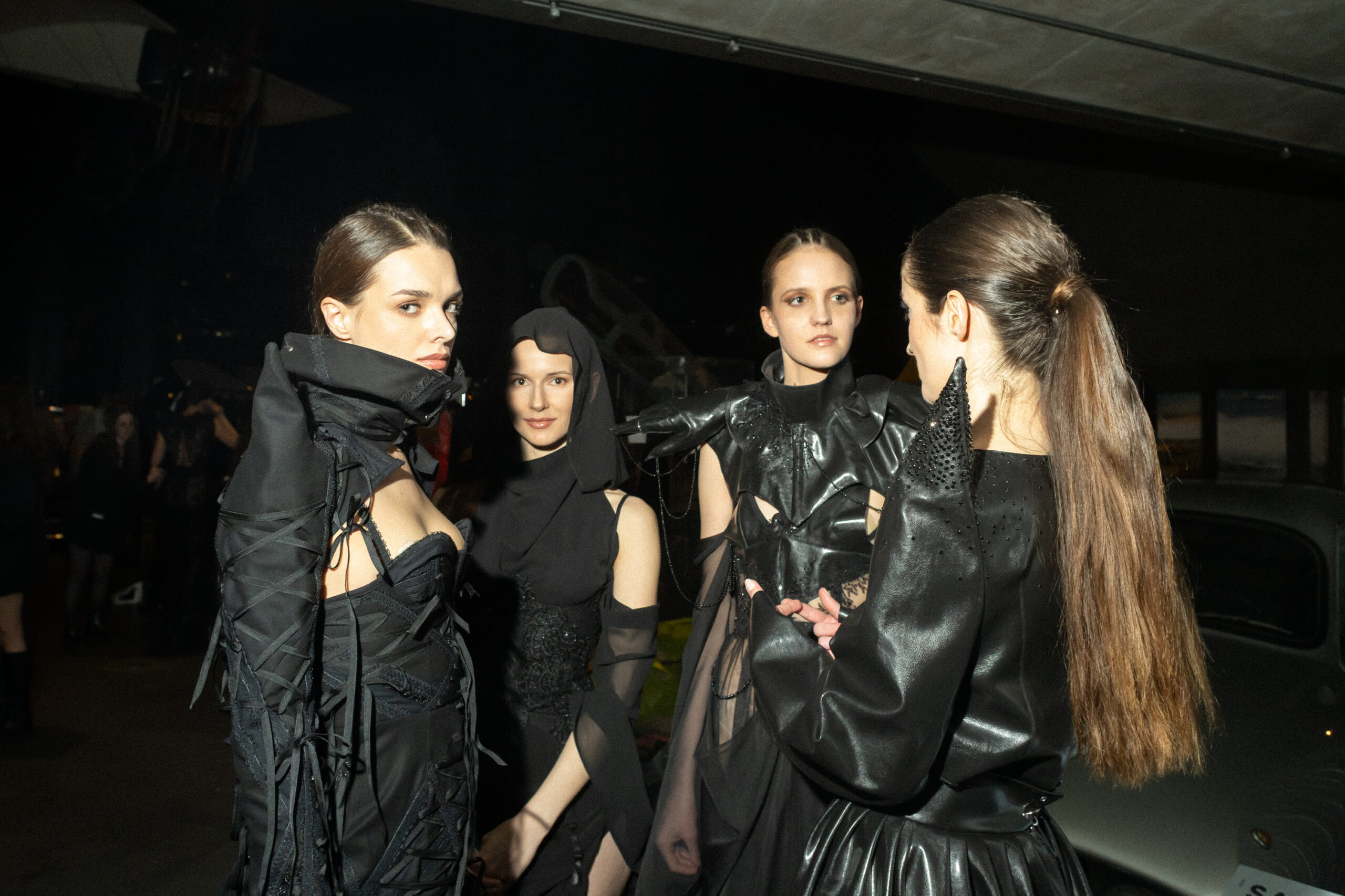 Na wybiegu pojawił się cały wachlarz estetyk: od cybernetycznego romantyzmu, przez gotycki dramatyzm, po stylizacje balansujące między modą a performansem. Jedna z modelek niosła na ramieniu czerwonego balonowego kurczaka, druga – na plecach sanki, jakby z dziecięcego snu wyrwanego prosto w dorosłość. W innym projekcie zauważamy postać oplecioną mechanicznymi rękami manekina – jakby człowiek i maszyna uczyli się czułości od nowa.